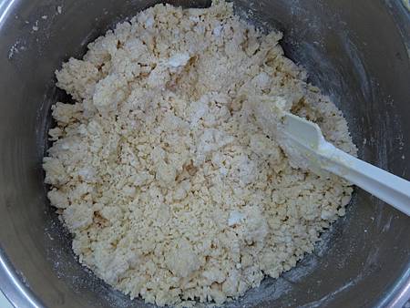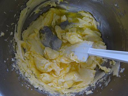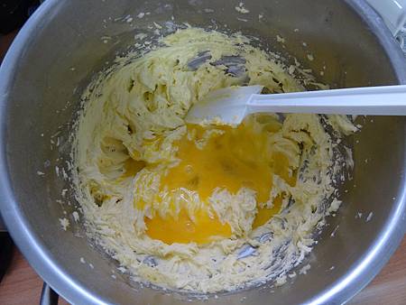 努力的將奶油弄得碎碎的,將蛋混在其中
