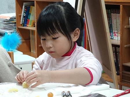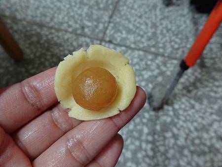 然後用大拇指,將外皮壓成扁皮,最後放入內餡,包起來,再搓圓